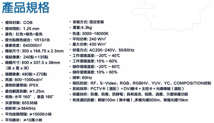 COB技術是將LED芯片集成在PCB板中,而非一般焊接於PCB板上的技術,有效提升了LED顯 示牆的發光光色,使整體顯示效果提升,且讓LED牆表面平滑,防撞、防塵、防潑水。 使用COB LED燈板打造出畫質逼真,色彩絕麗,自然鮮豔的LED電視牆